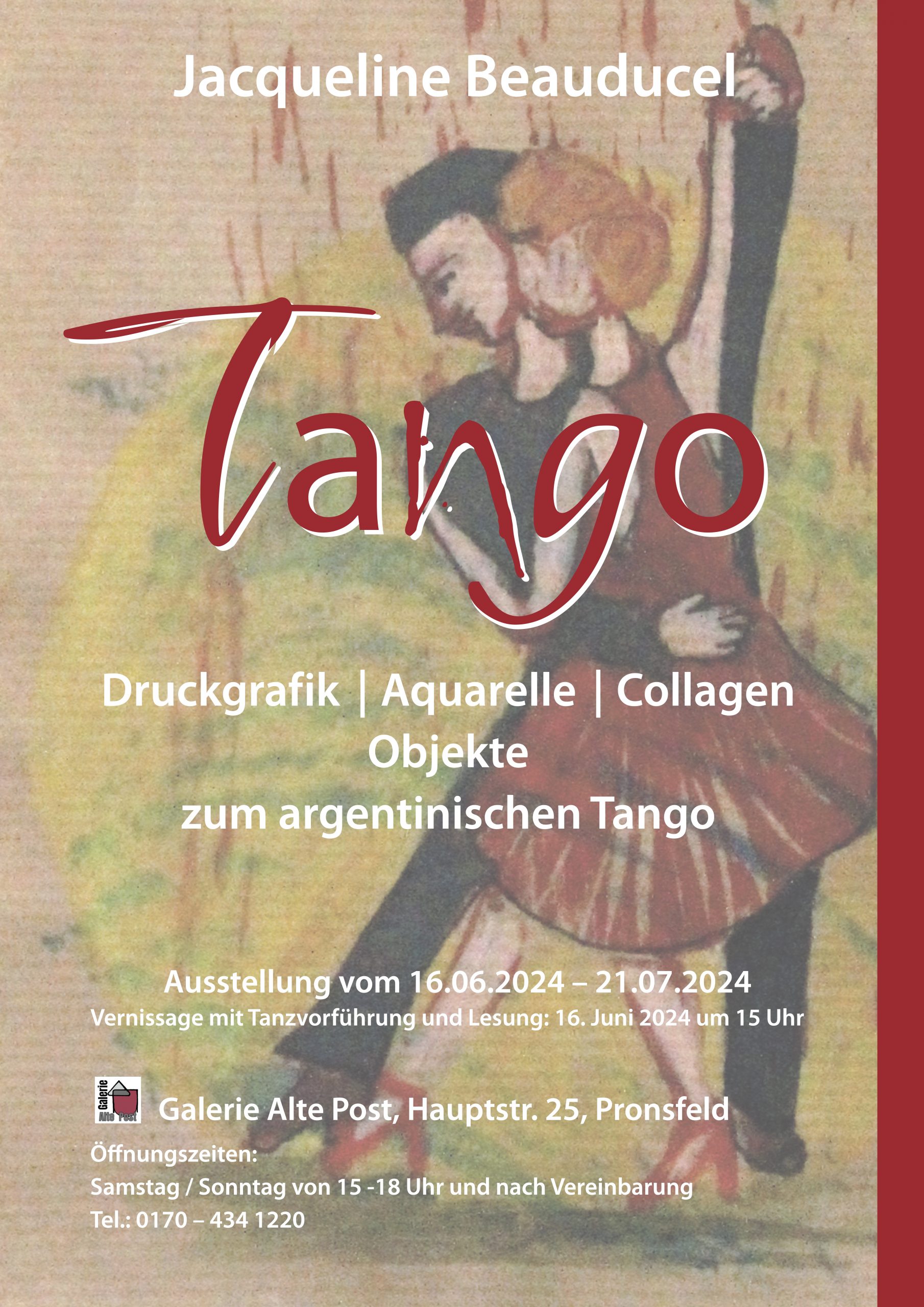 Dreh- und Angelpunkt der aktuellen Ausstellung in der Galerie Alte Post in Pronsfeld ist der Tango Argentino. Die Künstlerin Jacqueline Beauducel hat den Tango über Jahre hinweg durchlebt und durchlitten. Im Rahmen der Ausstellung übersetzt sie diese Erfahrungen in ihre persönliche Bildsprache und unterlegt sie – als Grundlage für ein Buchprojekt- mit Worten. In ihren